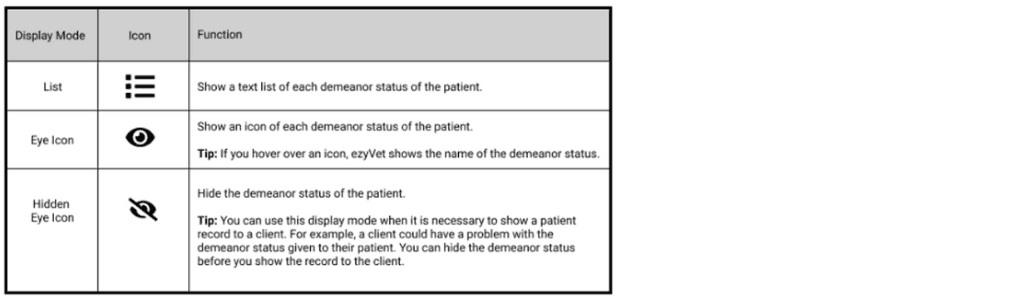 It’s no secret a visit to the vet can be a stressful, anxiety-ridden experience for the pet, which may cause them to react differently to how they would at home. We all know there aren't many clients that want to know their pet has be marked with an 'Aggressive' or 'Caution' label, and rightfully so. To help customize the experience for each client, we've added increased functionality which gives you control over what the client sees when you need to run them through a Patient or Clinical Record. By selecting the icon next to Demeanors in the sidebar it will change how the Demeanor status is displayed.