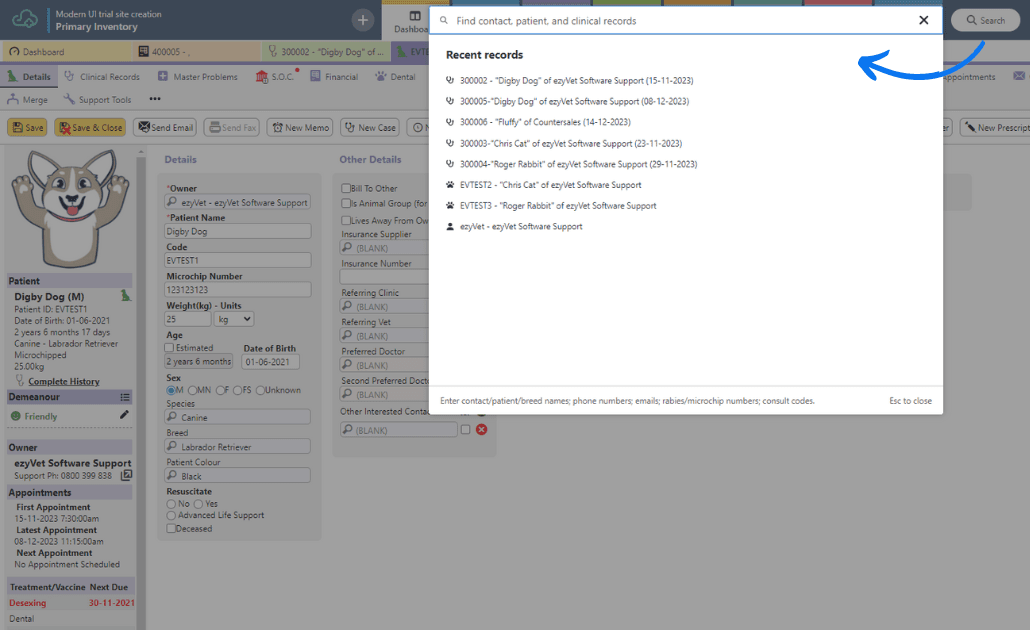 We said farewell to tedious searches! In 2023, ezyVet introduced the Global Search feature, offering one-click access to contacts, patients, and clinical records. Conveniently located at the top of ezyVet, it not only saves you time but also enhances practice efficiency, providing quick access to essential information for a seamless workflow.
