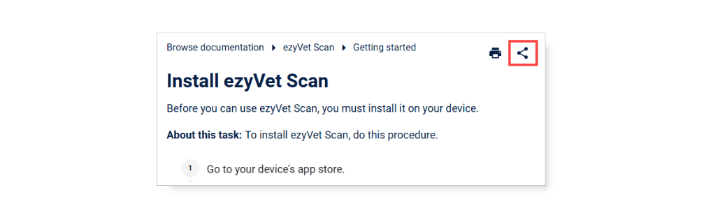 All documentation pages show a quick share button. Use the button to get a page link, or to easily send a documentation page to colleagues or clients.