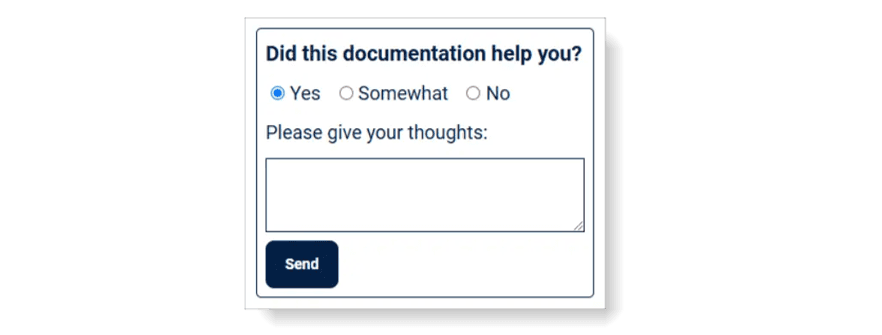 All documentation pages show a feedback form. Come across a documentation page that doesn’t give you the answers that you need? Use the form to tell us! A dedicated documentation team will look at your feedback and add updated content.
