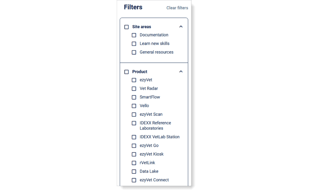 The search system in the new Knowledge Center has search filters that make it much easier to quickly find documentation for a specific product, audience, content type, and more. If you’ve ever found it a challenge to know which content in the Help tab is for ezyVet— as opposed to ezyVet Go, Vet Radar, or ezyVet Scan—you’re sure to love the new search filtering.