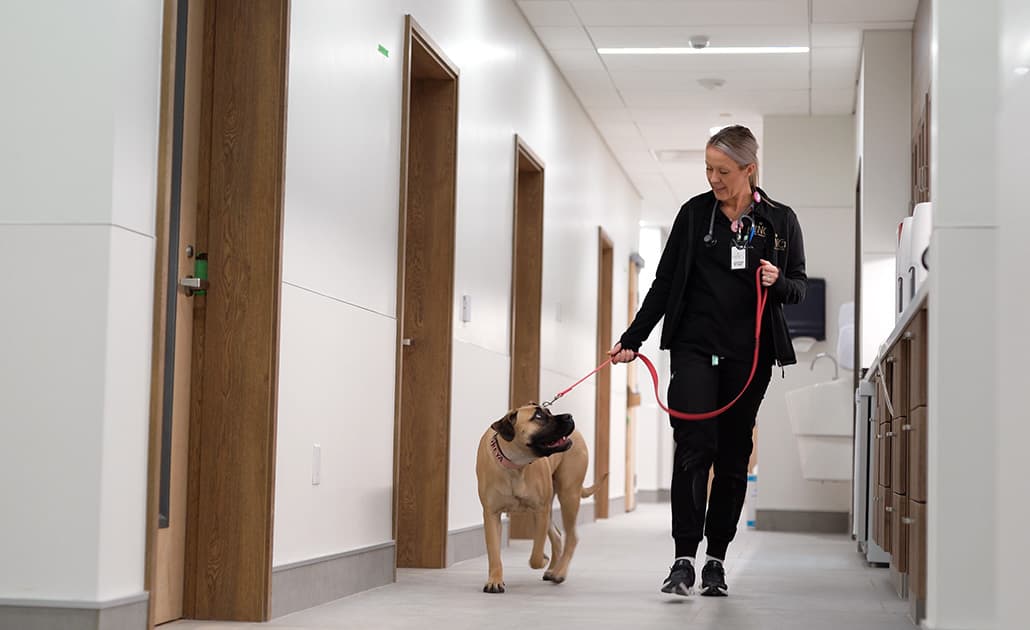There are a lot of parallels between King Animal Hospital and human hospitals. That’s no accident. Spread across 50 acres and staffed by more than 150 veterinary professionals, the four-story facility was intentionally designed around the same principles present in the human healthcare sector.